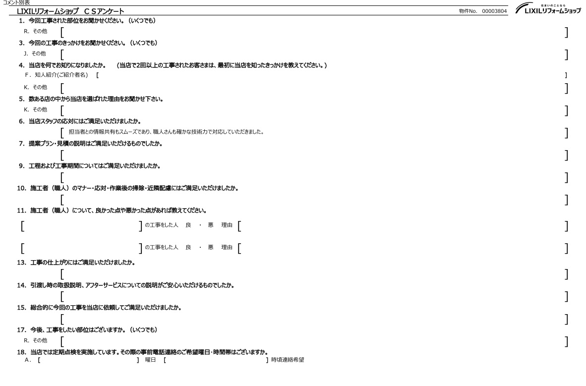 アンケートをいただきました。丁寧なあいさつ、丁寧な仕事ぶり、大変きれいな仕上がりで満足とおっしゃっていただきました。