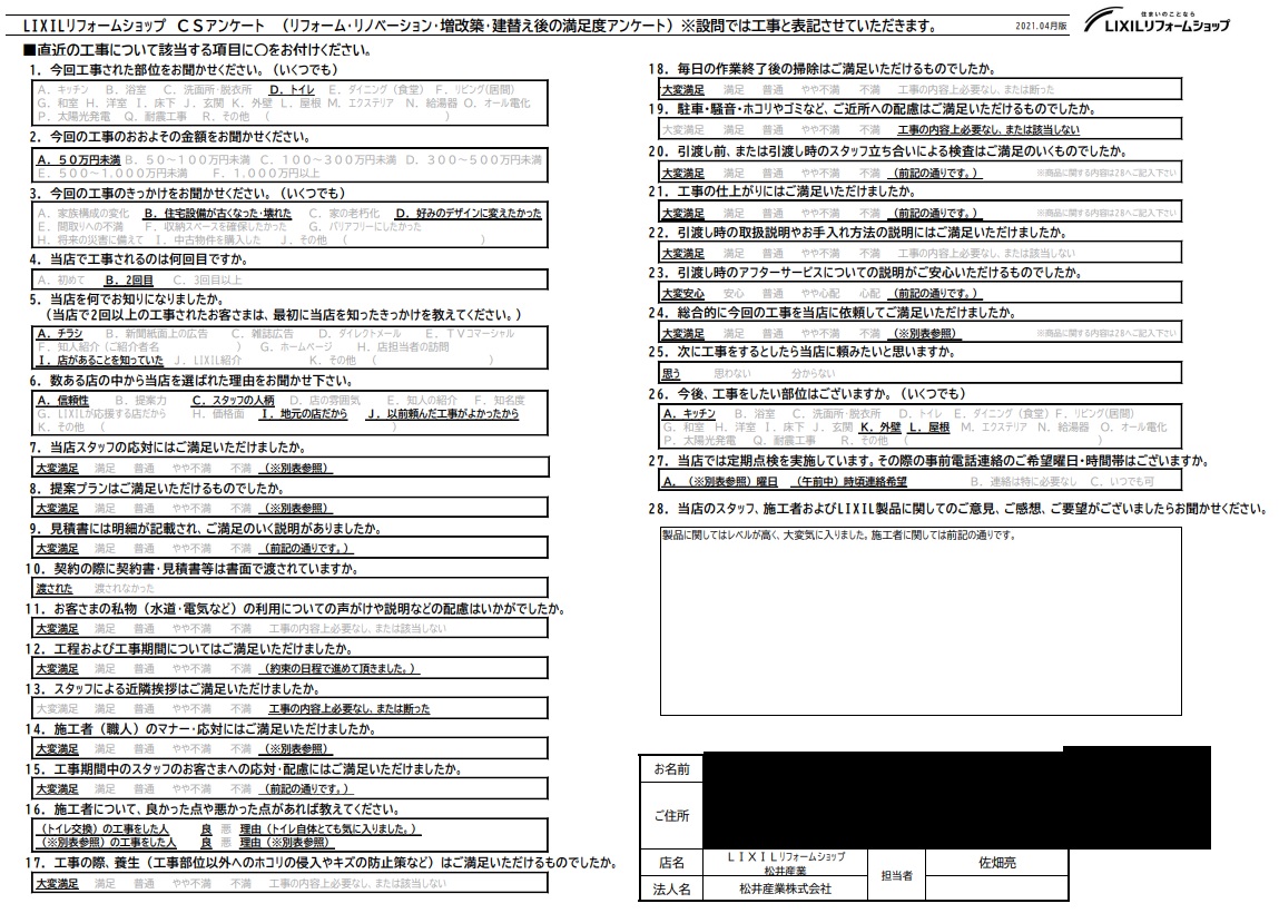 埼玉県三郷市M様邸トイレ工事アンケートをいただきましたので共有させていただきます。